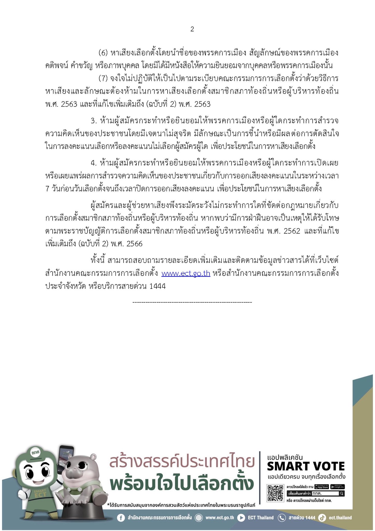 สำนักงานคณะกรรมการการเลือกตั้ง ประชาสัมพันธ์ลักษณะต้องห้ามในการหาเสียงเลือกตั้งสมาชิกสภาองค์การบริหารส่วนตำบลและนายกองค์การบริหารส่วนตำบล เพื่อป้องกันการฝ่าฝืนพระราชบัญญัติการเลือกตั้งสมาชิกสภาท้องถิ่นหรือผู้บริหารท้องถิ่น พ.ศ. 2562 และที่แก้ไขเพิ่มเติมถึง (ฉบับที่ 2) พ.ศ. 2566 และระเบียบคณะกรรมการการเลือกตั้งว่าด้วยวิธีการหาเสียงและลักษณะต้องห้ามในการหาเสียงเลือกตั้งสมาชิกสภาท้องถิ่นหรือผู้บริหารท้องถิ่น พ.ศ. 2563 และที่แก้ไขเพิ่มเติมถึง (ฉบับที่ 2) พ.ศ. 2563 ในการเลือกตั้งสมาชิกสภาองค์การบริหารส่วนตำบลและนายกองค์การบริหารส่วนตำบล ที่จะมีขึ้นในวันอาทิตย์ที่ 11 มกราคม 2569